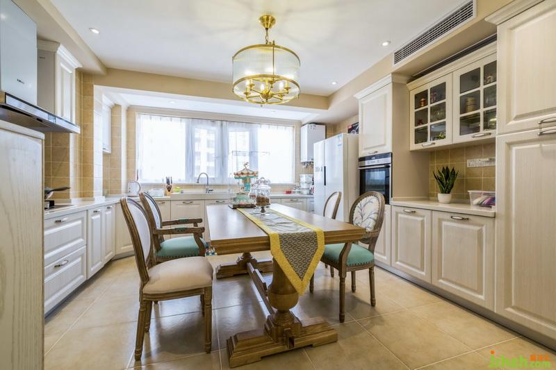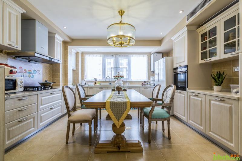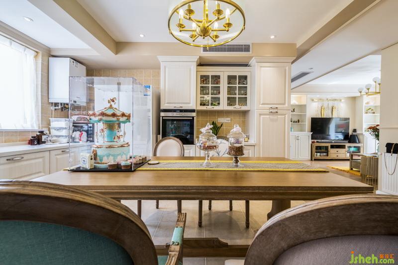 開放式的廚房既解決了進(jìn)門走道狹長(zhǎng)的問題,超大的操作空間、中西廚設(shè)備相結(jié)合,既能讓媽媽在廚房里大展身手,也能滿足女兒喜愛烘焙的小情趣。淺色復(fù)古磚配上線條流暢的美式櫥柜,簡(jiǎn)單大方,餐桌上方的黃銅吊燈提亮整個(gè)空間,都是不經(jīng)意間的小心思。