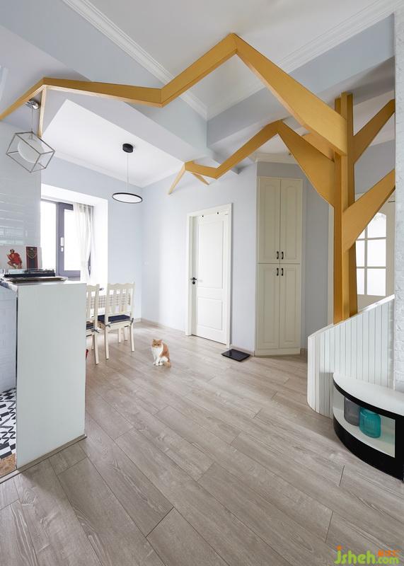 客廳整體的色調(diào)以白色木色為主,用藍(lán)色沙發(fā)跳色,使視覺上更加靈動。由于廚房空間有限雙開門冰箱放在沙發(fā)旁邊正好,冰箱用木工現(xiàn)場制作造型嵌入,沙發(fā)上方采用隔板與冰箱造型相連接形成一個(gè)整體,隔板上可以用來放置業(yè)主好多美美的照片和擺件,讓客廳更加溫馨,當(dāng)然也是加菲玩耍的空間。
