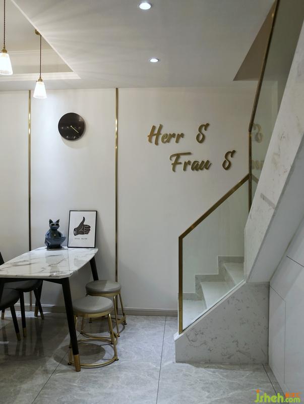 作為一樓到二樓的過渡地段,設計師用金色的扶手來裝飾,加入大型的植物墻紙,形成了一條美輪美奐的金色道路