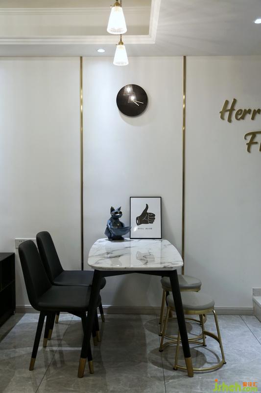 金屬線條流暢寫意,鋪貼于墻面,極具高級感,流水紋理般的煙灰色瓷磚,從客廳貫穿到餐廳,氣質(zhì)范兒十足