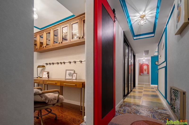 一旁的紅+黑配色的谷倉門,更是讓人一眼就愛上,它與過道盡頭的魔幻裝飾畫遙相呼應(yīng)!門后還暗藏玄機(jī),藏有一個(gè)書房!