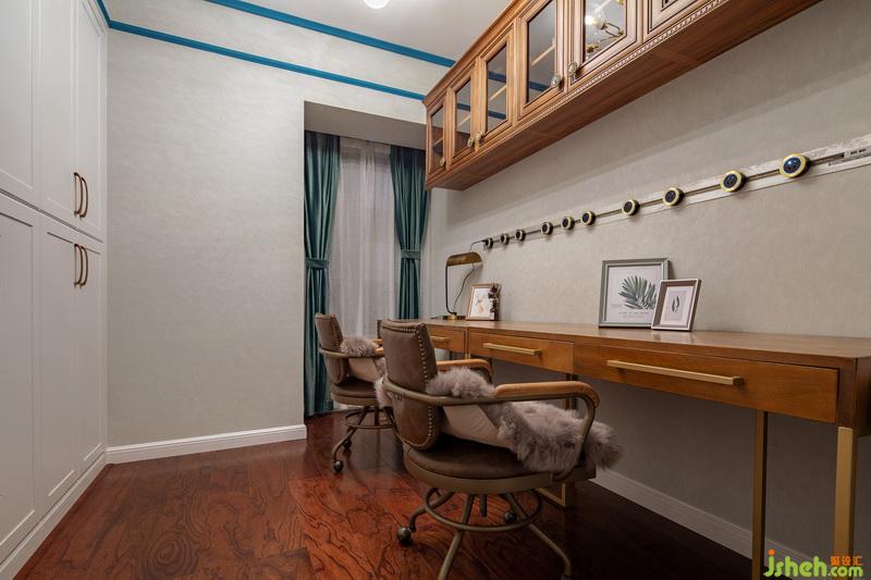 這間書房主要充當(dāng)辦公和儲(chǔ)藏區(qū)域。特意選用了復(fù)古的桌椅和吊柜,hold住空間的質(zhì)感。沿墻面分布著一排插座,可以同時(shí)給多個(gè)電子產(chǎn)品充電,辦公超爽滴~