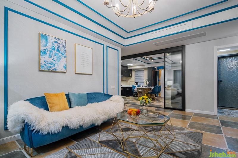 一進(jìn)門,這套作品就已經(jīng)很驚艷惹!藍(lán)色的線條配上燦爛的燈光,流光溢彩間給人一種美的享受,原本過于狹窄的過道,成了藝術(shù)走廊。地面用不同的花磚劃分出區(qū)域,墻面的藍(lán)色線條一直延伸到客廳,將各個(gè)獨(dú)立的空間連貫起來。
