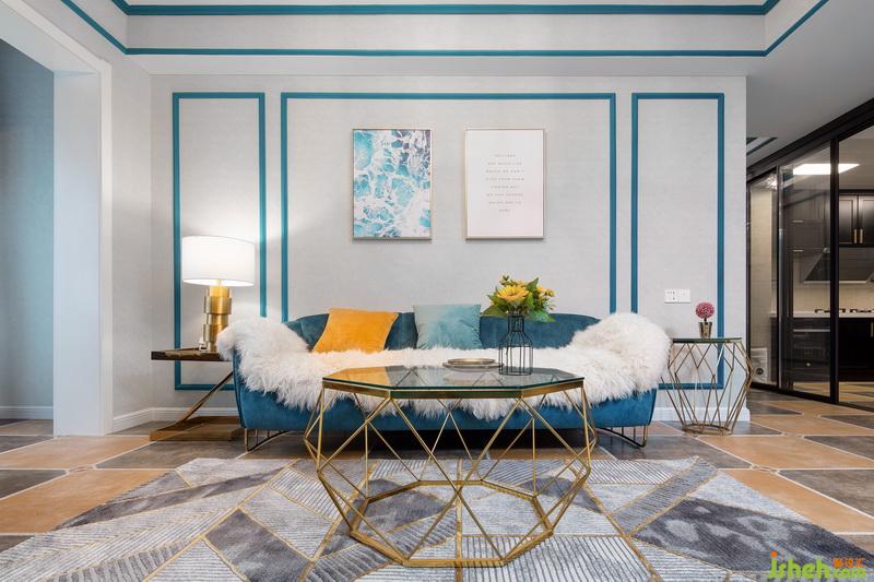 連接各個(gè)空間的藍(lán)色線條,作為背景墻更是神來之筆。配上ins風(fēng)的鏤空茶幾、幾何圖案的地毯、藍(lán)白裝飾畫,空間豐富多彩。從這個(gè)角度看過去,整個(gè)客廳更美了!