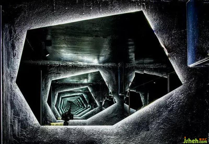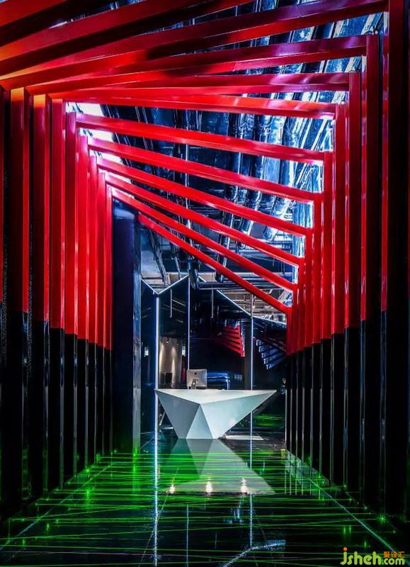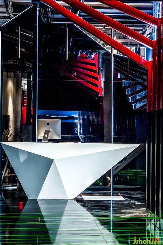 一開始進(jìn)門引入眼簾的就是紅黑結(jié)構(gòu)的鋼架,地面上綠色的激光線,營造出神秘的未來視覺感,白色的不規(guī)則造型前臺作為整個空間的提亮。