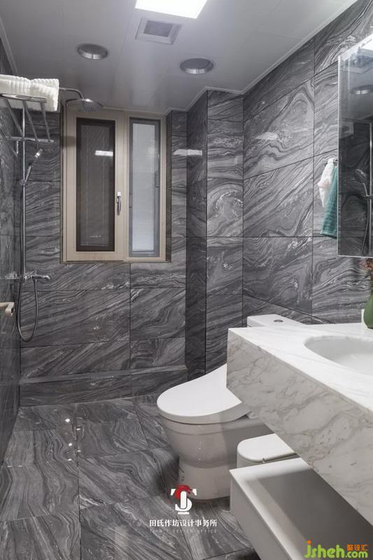 洗浴間雖小卻也是體現(xiàn)一個(gè)主人品味的關(guān)鍵所在,如流動(dòng)的水泥般的地磚和墻磚和諧統(tǒng)一,同時(shí)也考驗(yàn)貼磚師傅的手藝,洗手池下方的臺(tái)面也足夠擺放一些雜物。