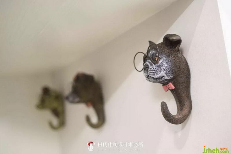 空白的墻面上室內(nèi)設(shè)計(jì)師自然也不會(huì)放過,復(fù)古銅色的動(dòng)物掛鉤給墻面帶來一絲趣味,自然也給鑰匙們提供了“家”。