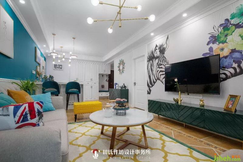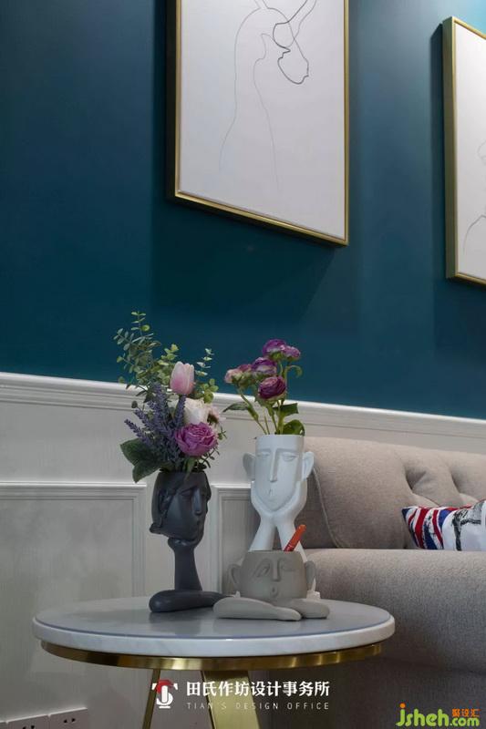 一進(jìn)門,映入眼簾的就是一副巨大的裝飾畫,跳躍的配色給房屋整體藍(lán)白色的主調(diào)增添了一絲活力?;野椎谋尘皦γ嬉餐瑫r(shí)將整幅作品襯托地恰到好處,讓我們一進(jìn)門就有家的氛圍。