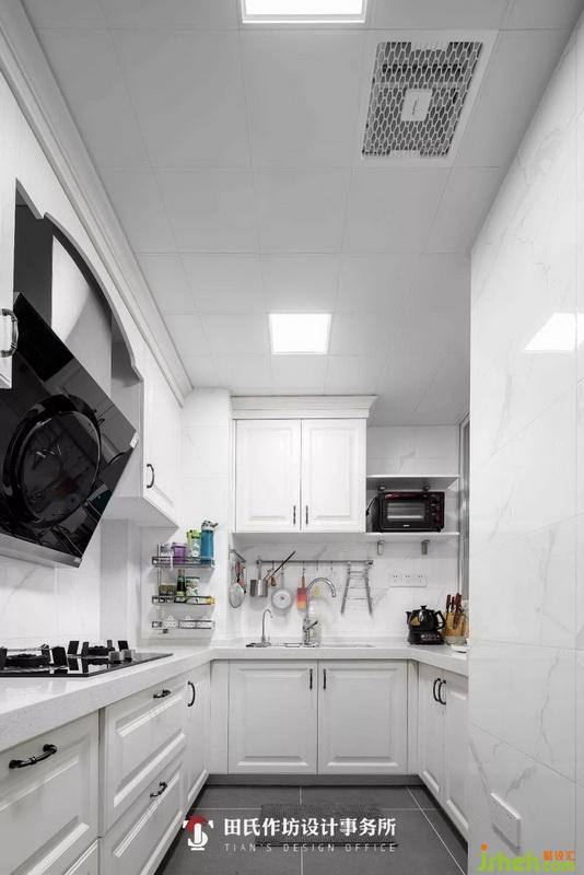 進(jìn)門的左側(cè)就是這家的廚房啦~和走廊的鞋柜一樣,廚房同樣采用白色柜體,而水灰色的地面和大片的白色柜體將廚房的整體面積在視覺上擴(kuò)大了不少,給人一種清爽簡(jiǎn)潔的感覺,在這樣的環(huán)境中做飯或許也成了一種樂趣吧。