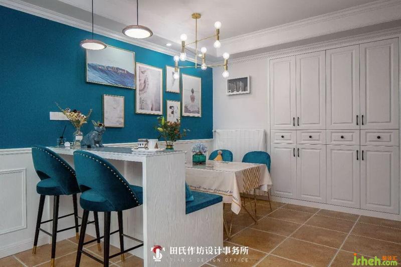 穿過走廊,就是我們的餐廳,在這個(gè)案子中,設(shè)計(jì)師并沒有用墻面或是玄關(guān)將客廳與餐廳明確區(qū)分,反倒是在這兩者之間放置了一個(gè)小吧臺(tái),給房屋進(jìn)行分區(qū)的同時(shí)又為生活增添了一份儀式感。藍(lán)色布面的椅子與墻面,拿坡里黃的桌布又與地磚形成了呼應(yīng),將軟裝與硬裝完美結(jié)合。金屬和球型燈泡為主體的吊燈也讓餐廳多了一分現(xiàn)代風(fēng)。