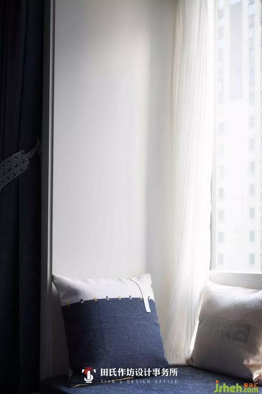 飄窗的白色半透明紗簾給房間帶來了浪漫唯美之感;藏藍(lán)色軟墊和亞麻面料的靠枕又與客廳的現(xiàn)代簡(jiǎn)約地中海風(fēng)格相互呼應(yīng),融為一體。