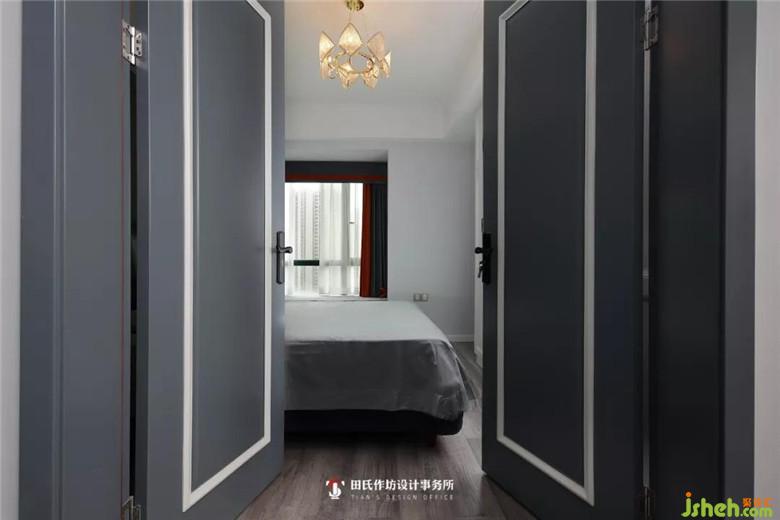所有臥室門采用加高木門,顏色與整體灰藍(lán)色相呼應(yīng),主臥室雙開木門更加大氣,每次業(yè)主推門進(jìn)入房間休息時(shí),都有滿滿的儀式感?;宜{(lán)和深紅的遮光窗簾搭配透明白紗營造浪漫的歐式復(fù)古風(fēng)情。