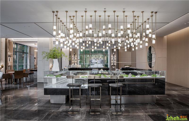 沙盤區(qū)至上而落的藝術(shù)燈具,以“水滴”漣漪在水中變幻形態(tài)為設(shè)計(jì)發(fā)想,輕盈飄逸。整體視覺空間形成聚焦,令觀者留下深刻記憶點(diǎn)。