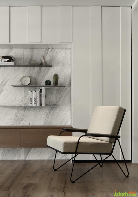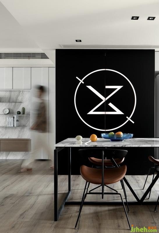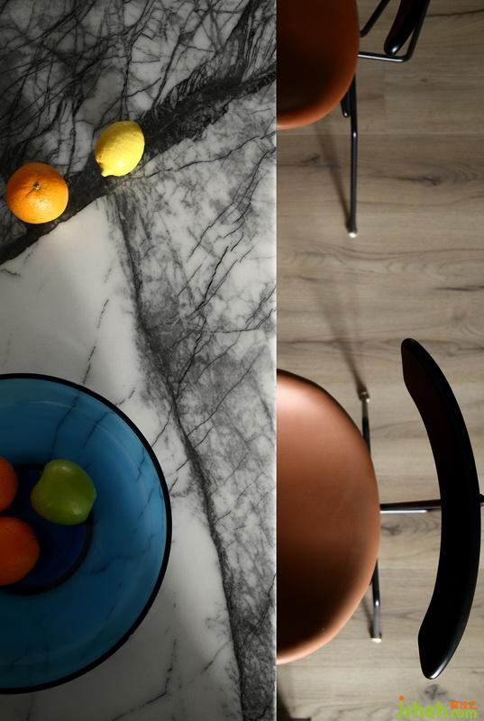 ▲開放式的布局令窗外的綠意美景與光線盡情的穿行室內(nèi),線條利落的大理石餐桌與造型時尚的餐椅,打造出簡約卻不簡單的用餐環(huán)境。不論是煥發(fā)著生機的綠植還是超個性的發(fā)光雕刻鋼板,在這里都被不斷的放大,讓動與靜、明與暗、冷與暖達到平衡。