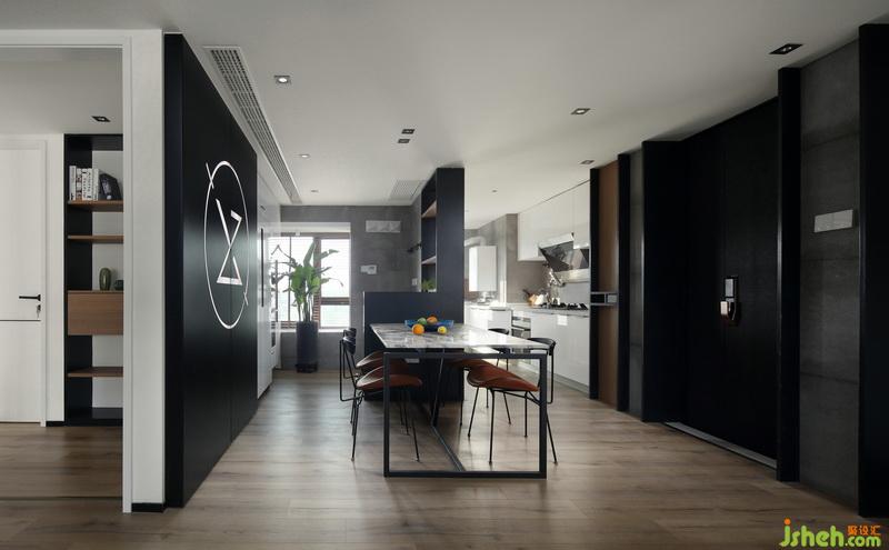▲黑色的入戶門門復古而典雅,玄關背景采用超大面鋼板雕刻屋主姓名組成的logo,加上透光板和燈光,成品非常有質(zhì)感與腔調(diào)。