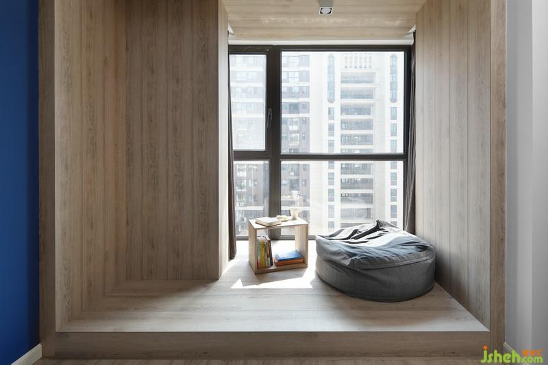 ▲從客廳的淺灰到臥室的深藍(lán),并加入了更多的木質(zhì)元素,以“和而不同”,區(qū)分出空間的獨(dú)立性。室內(nèi)設(shè)計(jì)師為了擴(kuò)大區(qū)域,拆除原飄窗,將木地板延伸到飄窗上,別具一格。