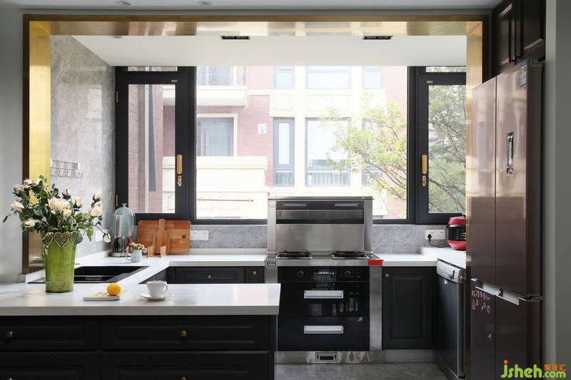 ▲開放式的布局令光線、空氣、甚至是映射進(jìn)室內(nèi)的綠植都成為了貫穿功能區(qū)的線索,廚房區(qū)顯得輕盈而靈動(dòng),各功能區(qū)之間相互融合。室內(nèi)設(shè)計(jì)師把櫥柜設(shè)計(jì)運(yùn)用深灰色區(qū)別于其他區(qū)域,卻又很好的融合一起,U字型的櫥柜足夠在這個(gè)小天地中,烹飪充滿愛的美食...