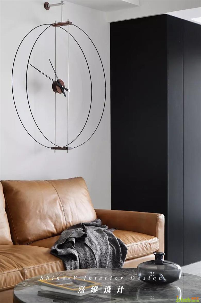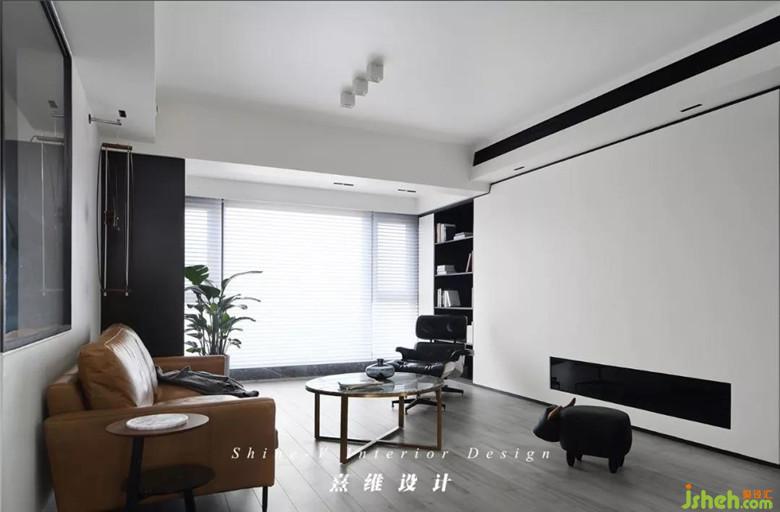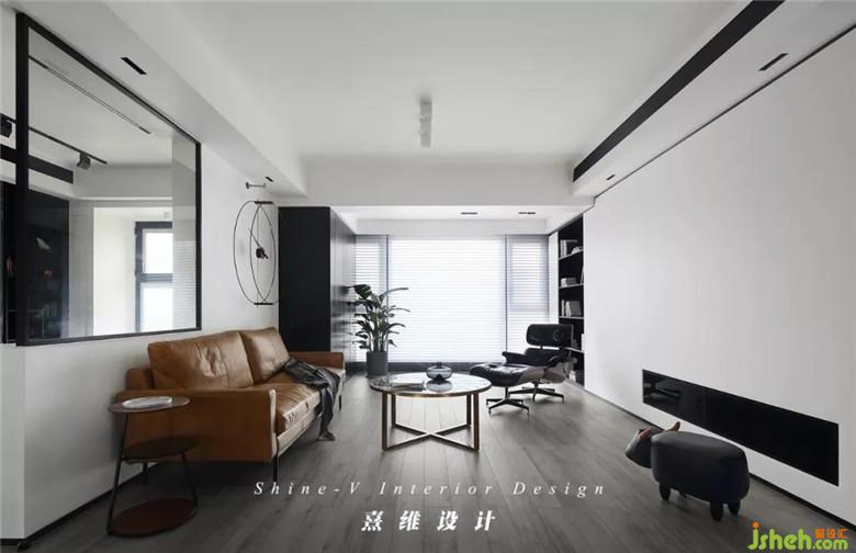 ▲以黑白灰色為空間基調(diào)——入戶便能感受到整個空間濃郁的簡約現(xiàn)代風,其中沙發(fā)作為客廳中的主體家具,以暖色調(diào)棕色進行點綴、中和。沙發(fā)后便是書房,室內(nèi)設(shè)計師通過玻璃隔斷的處理方法保證了室內(nèi)的采光,光線的暈染下,家具更有質(zhì)感,織品更加舒適,黑色與棕色也避免了沉悶。