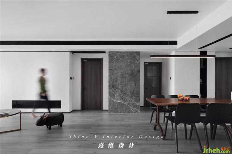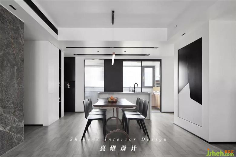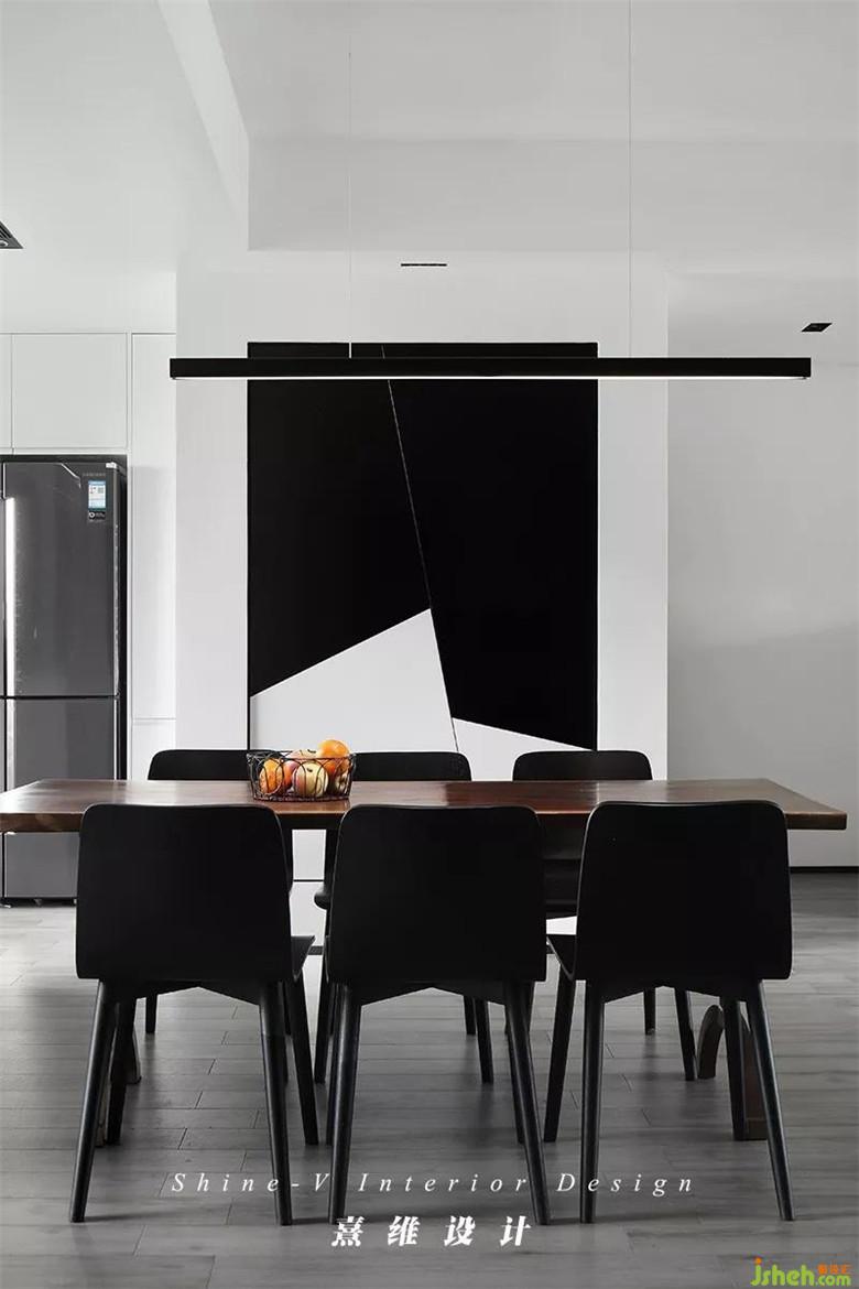 ▲以開放式的布局讓餐廳同樣可以享受到充沛的光線,使這片場(chǎng)域的視野也開闊起來。室內(nèi)設(shè)計(jì)師用幾何圖形肆意的規(guī)劃餐廳背景墻,賦予空間變化,間富有層次。當(dāng)然這面背景墻不僅僅是裝飾,也是用于電箱的遮蔽和儲(chǔ)物。