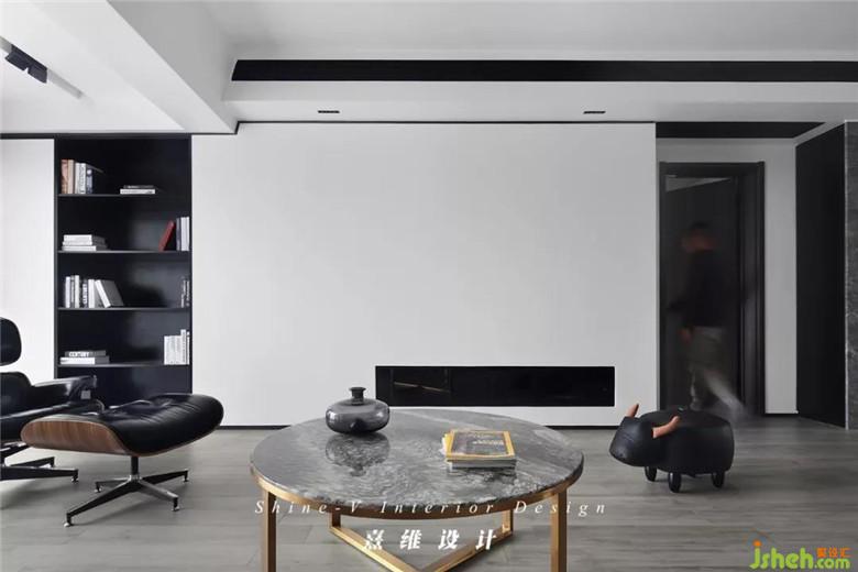 ▲從玄關(guān)處看向客餐廳,電視背景墻大量留白以便業(yè)主增設(shè)激光電視,其中留白中內(nèi)嵌了抽屜和儲(chǔ)物區(qū),以下翻門的形式打開充當(dāng)電視柜的功能,抽屜拉出來則可以放置激光電視投影機(jī),灰玻材質(zhì)的下翻門又不失設(shè)計(jì)感——收納與美觀兼具。