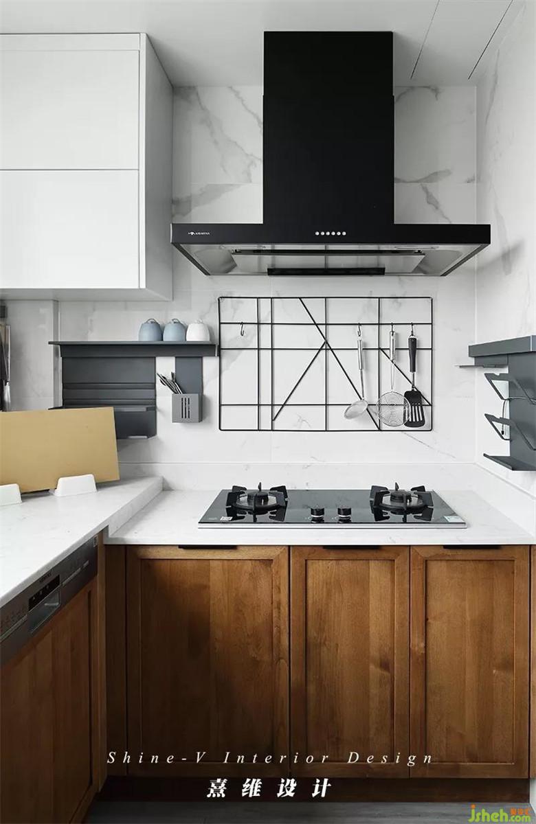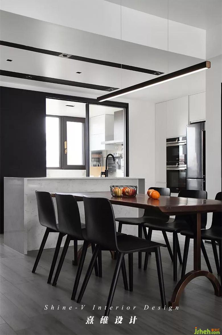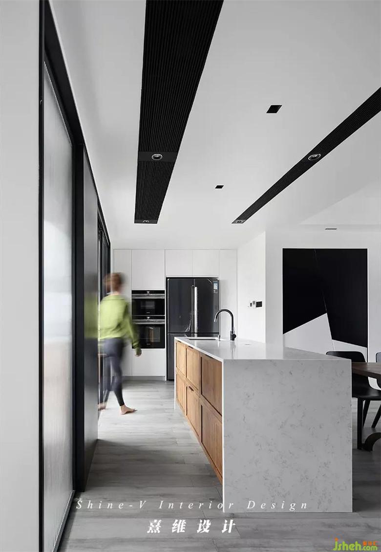 ▲西廚區(qū)在黑白灰主色調的基礎上柔和了木色,讓整個空間調和的更具溫度。黑色的加長風口和嵌入式射燈也讓空間頂面設計更加出彩,燈光與整體空間的氛圍營造密不可分!