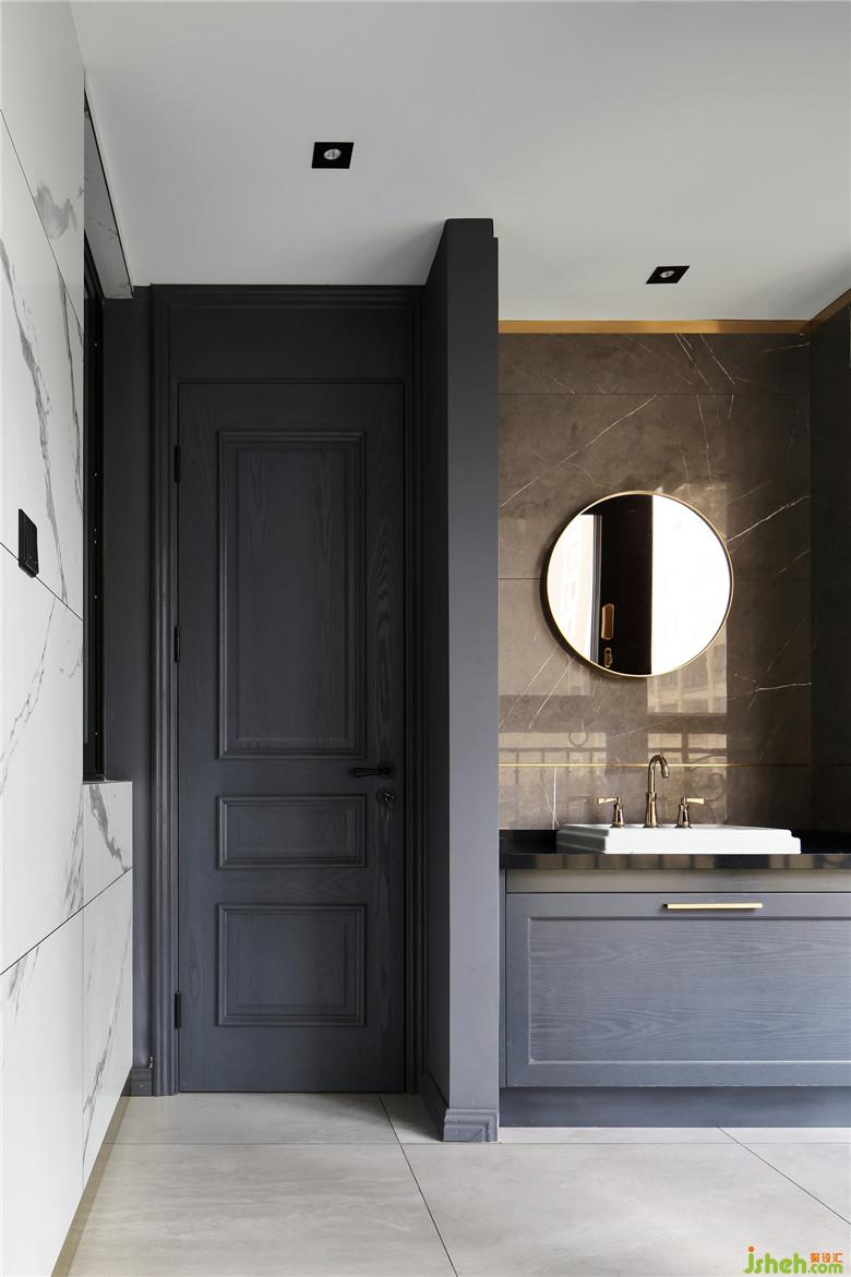 客衛(wèi)的干區(qū),做了臺盆干濕分離的設(shè)計,配色上采用大面積深色仿石材瓷磚搭配金色元素,延續(xù)了整屋的深灰色元素。全屋的門套線均是做到頂,視覺上拉升了房屋的高度。整體灰色調(diào)搭配金色點綴,增加了一份寧靜和優(yōu)雅!室內(nèi)設(shè)計師