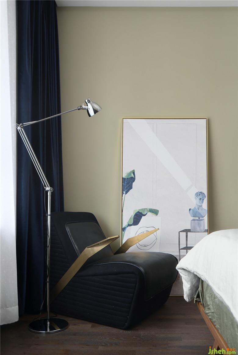主臥的背景墻設(shè)計依舊延續(xù)了客餐廳的灰色設(shè)計元素,使用高位的護(hù)墻板以達(dá)成整體的風(fēng)格統(tǒng)一性,深色的窗簾可以增加睡眠的舒適度。角落的單人沙發(fā)搭配宜家的落地?zé)簦蔀榱宋葜髯類鄣拈喿x角。