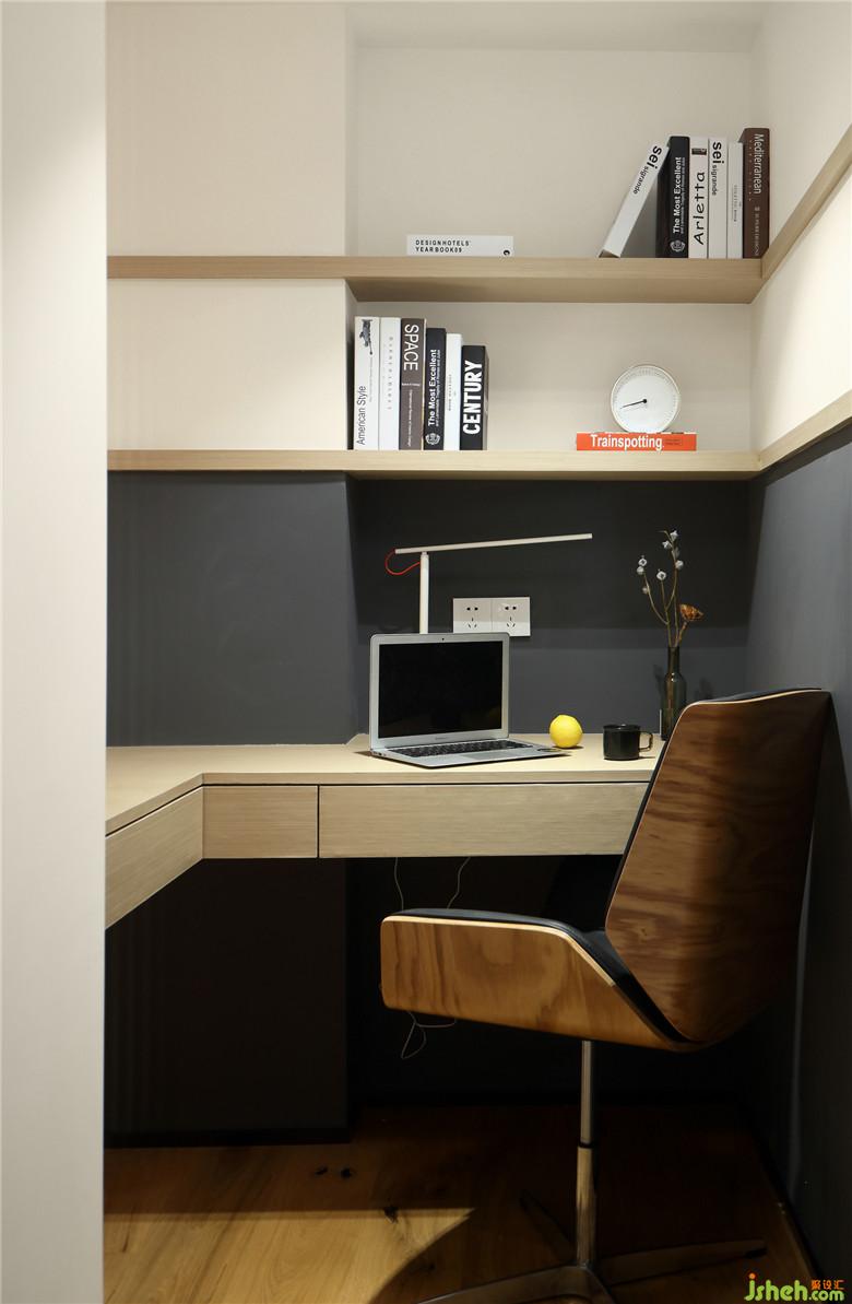 ▲定制的實(shí)木隔斷替代了原始戶(hù)型結(jié)構(gòu)中的實(shí)墻,室內(nèi)設(shè)計(jì)師將這個(gè)狹小空間改造成了半開(kāi)放的小書(shū)房,虛虛實(shí)實(shí),明明暗暗,小空間有了新生。小書(shū)房定制的挑板型書(shū)架結(jié)+書(shū)桌,結(jié)合戶(hù)型中存在的立柱加以充分利用。墻面一半刷白色乳膠漆,一半刷深灰色黑板漆,小書(shū)房因而更顯精致。