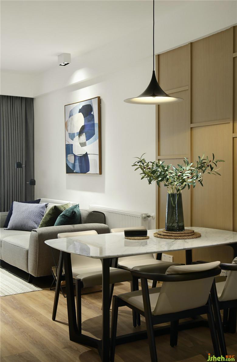 ▲餐廳區(qū)域以定制的木質(zhì)造型墻作為這片區(qū)域的裝飾和起到劃分功能區(qū)的作用,木元素的運用貫穿室內(nèi)。室內(nèi)設(shè)計師精心挑選的裝飾畫,木質(zhì)溫潤的餐椅,質(zhì)感優(yōu)雅的大理石餐桌,每件單品的選擇都是想為家增加一抹藝術(shù)氣息。