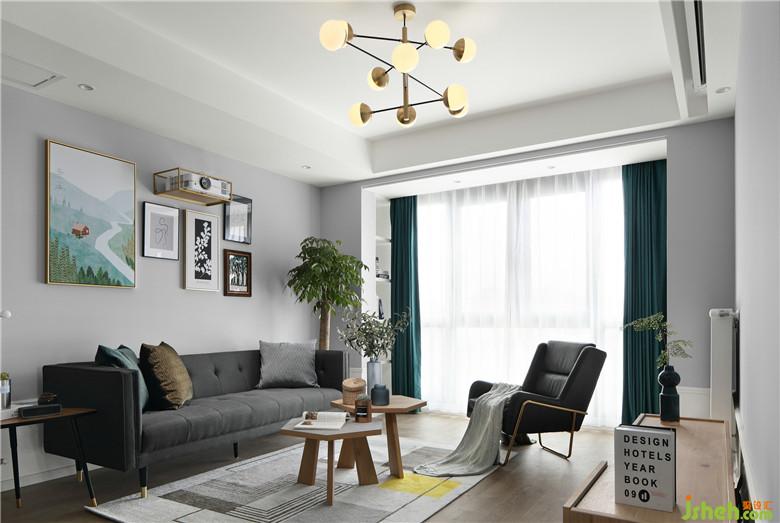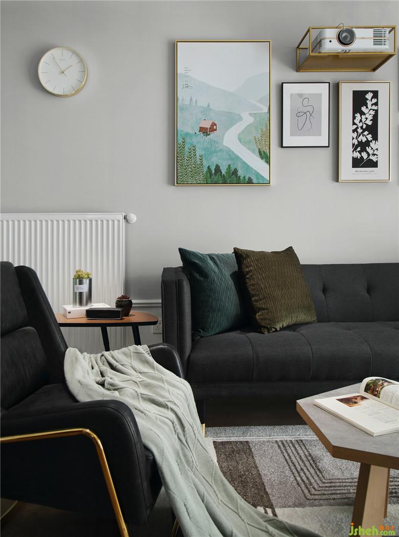 ▲將原戶型陽臺并入客廳擴大區(qū)域,也增加了客廳的采光使之更通透溫暖。室內(nèi)墻體以淺灰色為底,室內(nèi)設(shè)計師以深色家具作為重色壓住整個空間,將屋主喜愛的綠色貫穿到室內(nèi)裝飾上,裝飾畫、抱枕亦或是窗簾,都與全屋和諧的搭配著。