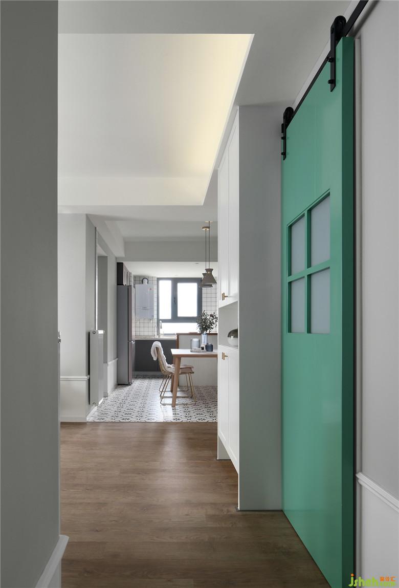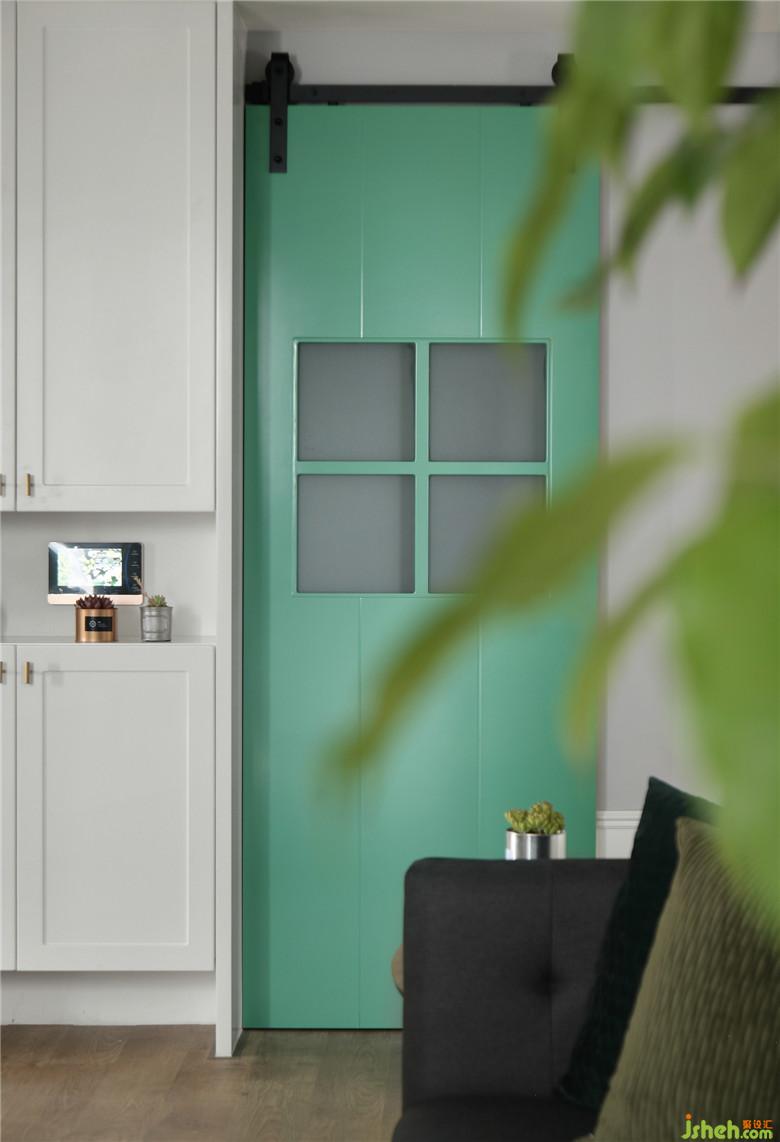 ▲入戶左手邊是定制的鞋柜,白色的柜體與旁邊的綠色谷倉門相得益彰。室內(nèi)設(shè)計師將公共空間以低矮的白色護墻板圍繞,增加室內(nèi)的美觀性的同時讓墻面形成層次感??蛷d設(shè)置投影儀,六邊形的木質(zhì)組合茶幾,幾何形地毯與舒適的布藝沙發(fā),一家人可以悠閑地享受家庭影音時光,客廳是能夠放松下來休憩的空間。