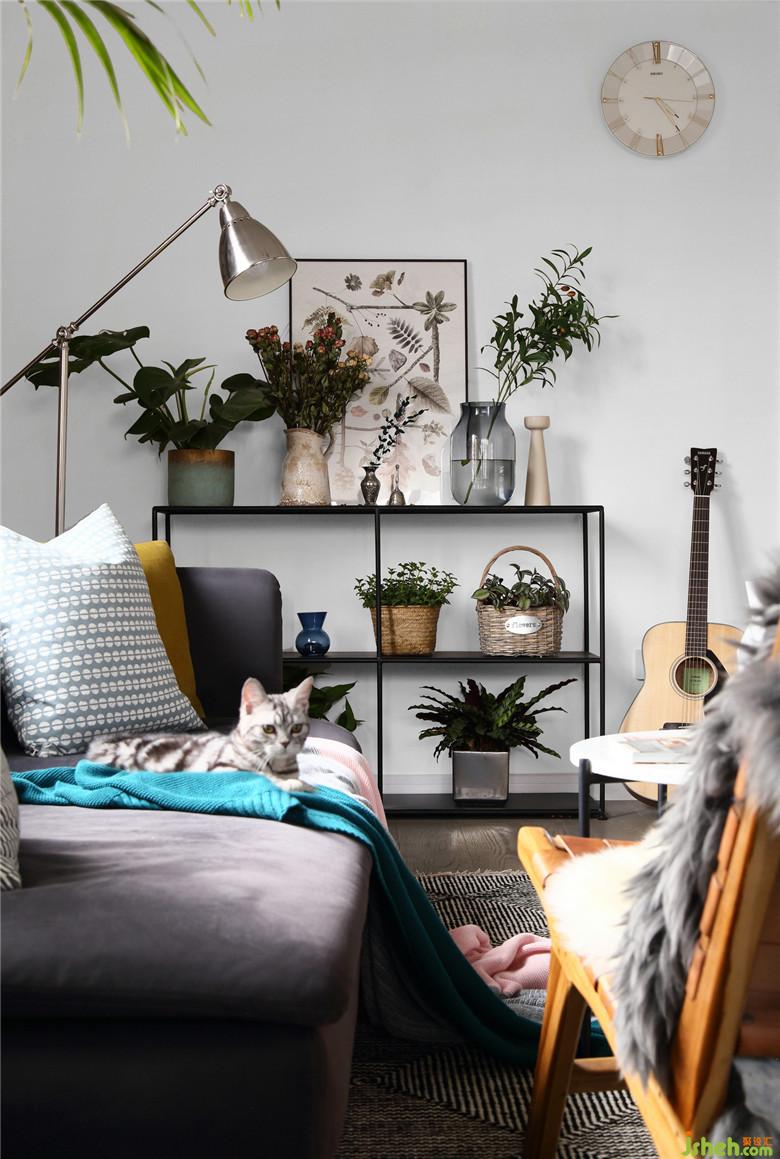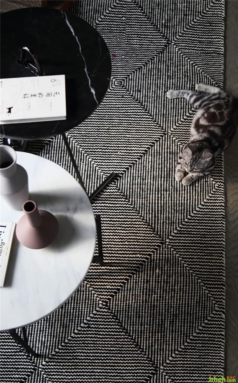 ▲在這個面積并不開闊的空間里,室內(nèi)設(shè)計(jì)師將不同的元素進(jìn)行著比對,而黑色金屬線條的置物架,不僅滿足了展示收納功能,也不顯得空間擁擠,恰到好處的交織出奇妙的平衡感。屋主夫婦的內(nèi)心一定是柔軟而充滿童趣的,粉色木馬仿佛回到了童年,彈著木吉他,有一只他和她的貓。