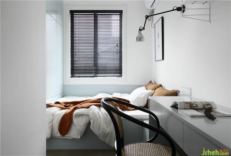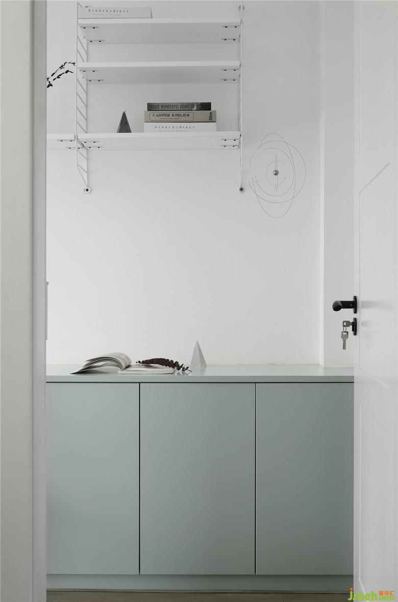 ▲次臥室空間將榻榻米、衣柜和床頭柜及書桌做了一體化結(jié)合設(shè)計(jì),而避免空間中單一色系,設(shè)計(jì)師將這片區(qū)域以清涼的薄荷綠冠以整體定制柜。這樣的整體定制設(shè)計(jì)不僅使空間利用率最大化,并且解決了空間儲(chǔ)物需求。墻上的置物架和裝飾品也都精心挑選,盡力將空間更具美好而有設(shè)計(jì)細(xì)節(jié)。無(wú)設(shè)計(jì)不生活。