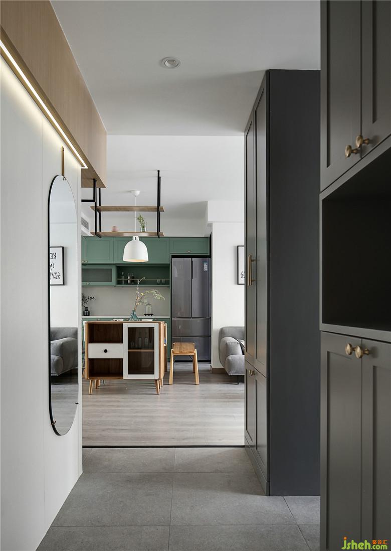 ▲入戶設(shè)置了鞋帽柜滿足屋主的日常生活需求,除了提供儲(chǔ)存空間外,也弱化了次衛(wèi)空間,形成半遮蔽區(qū)域。入戶左側(cè)墻體以白色護(hù)墻板一直包裹到門套,穿衣鏡的設(shè)置也是極大的便于屋主出門時(shí)的著裝整理。頂部以一圈燈光豐富了空間層次,室內(nèi)設(shè)計(jì)師為空間增添了一份浪漫與柔和。
