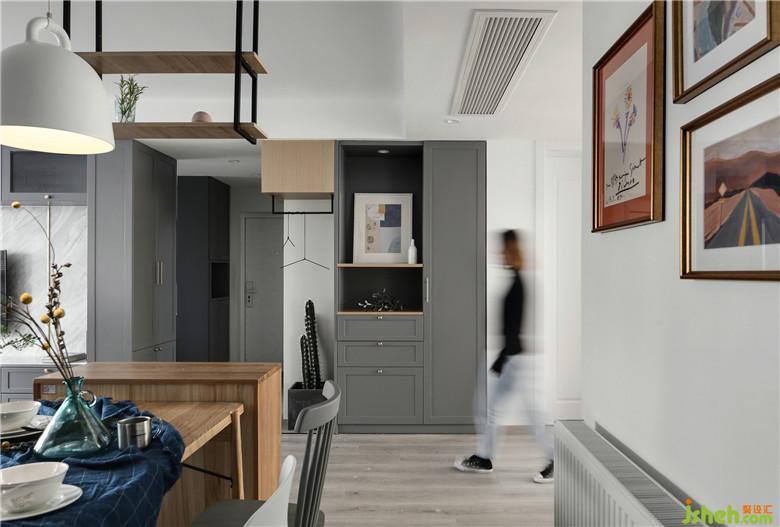 ▲從餐廳處看向入戶玄關(guān),淺灰色的收納柜與入戶鞋帽柜呼應(yīng)設(shè)計(jì),半開放式的布局也是家中進(jìn)行展示的巧妙位置。原本柜體這塊有部分隔墻,造成了從入戶看向客餐廳阻擋視線的弊端,而室內(nèi)設(shè)計(jì)師將隔墻打掉,同時(shí)為了擴(kuò)大主衛(wèi)空間,將主衛(wèi)墻體向外推,最終留出收納柜的深度。收納柜頂部的木色塊體底部?jī)?nèi)嵌了燈管,下方設(shè)置了一個(gè)置衣架,這樣不僅使空間通透不阻擋視線,也方便于回家后外套的放置。
