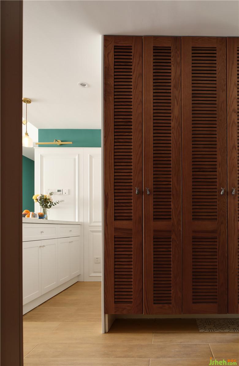 ▲正對(duì)入戶門(mén)的位置室內(nèi)設(shè)計(jì)師設(shè)置了收納空間,實(shí)木百葉柜門(mén)展現(xiàn)了品質(zhì)感,百葉樣式的設(shè)計(jì)增添通透感,使入戶第一眼不會(huì)覺(jué)得太過(guò)死板。充足的儲(chǔ)存空間可以滿足日常的鞋子的收納需求。