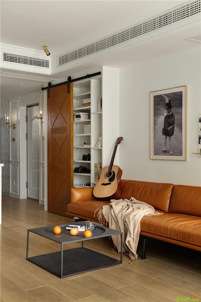 ▲室內(nèi)設(shè)計(jì)師在材質(zhì)、顏色搭配或是功能區(qū)布局上,以靈動(dòng)、多用途進(jìn)行規(guī)劃。客廳部分的收納空間采用了半開(kāi)放式谷倉(cāng)門(mén)的形式,半開(kāi)放式的設(shè)計(jì)半藏半露,凸顯了生活趣味感,谷倉(cāng)門(mén)的利用,帶來(lái)了美式鄉(xiāng)村的氣息也為客廳空間添加了個(gè)性特色。