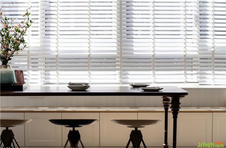 ▲原本餐廳的位置過于狹小,無法一家五口的用餐需要。室內(nèi)設(shè)計(jì)師將此處設(shè)計(jì)成吧臺式西餐島臺的形式,櫥柜采用淺原木色,符合西式簡餐的氛圍。
