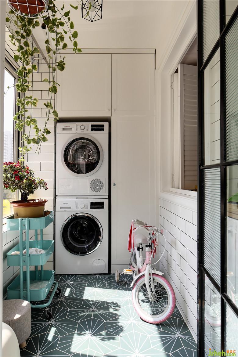 ▲陽臺部分與餐廳部分有由玻璃推門連接,與兒童房的窗戶做了百葉折疊窗為遮擋。白色墻磚搭配花紋地磚干凈、清新。洗衣機(jī)烘干機(jī)嵌入式放置節(jié)省空間,收納柜滿足日常生活收納。