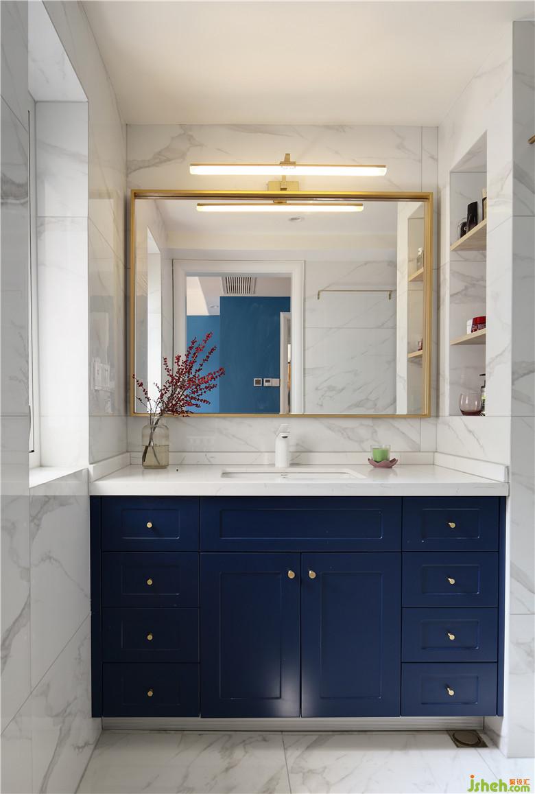 ▲衛(wèi)生間部分采用干濕分離形式,主衛(wèi)部分干區(qū)的柜體采用了跟床頭背景墻相呼應(yīng)的沉靜的藍(lán)色,白色大理石紋的貼磚增添清爽、潔凈感,黃銅色包邊的鏡子和鏡前燈也起到畫龍點(diǎn)睛作用。