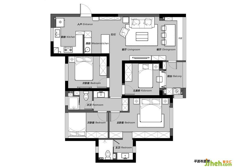 ▲次衛(wèi)的衛(wèi)生間干區(qū)設(shè)置在靠近老人房間的位置,方便使用。風(fēng)格上與過道風(fēng)格保持一直,形成完整的視覺觀感。洗手臺后白色六角形貼磚豐富視覺效果。