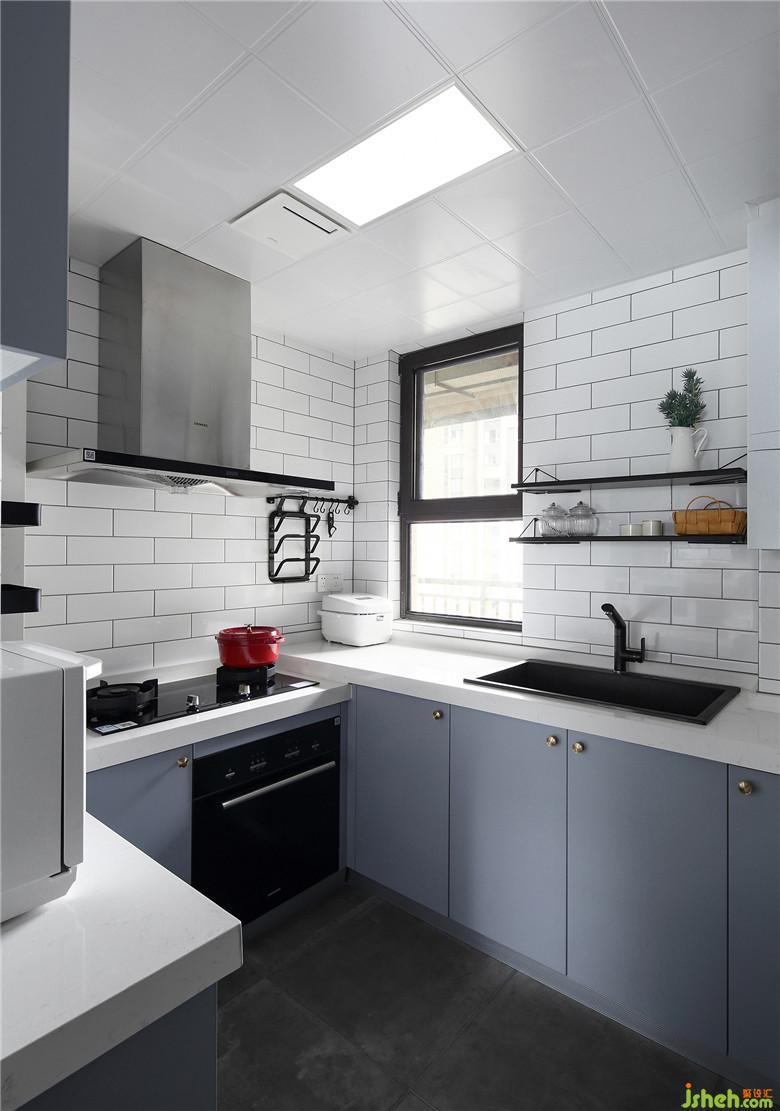 室內(nèi)設計師改變了廚房門的位置,讓客餐廳與廚房連集中在一起,日常生活動線也更方便。藍與白色將廚房空間點亮,定制的櫥柜可以廚房的雜物都藏起來,只留下清爽。
