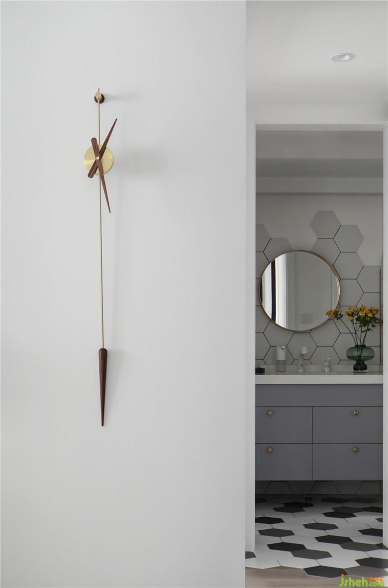 衛(wèi)生間干區(qū)不規(guī)則拼貼的六角地磚從地面綿延到墻上,與客廳的極簡掛鐘相映成趣,家就是從這樣的角度可愛起來。