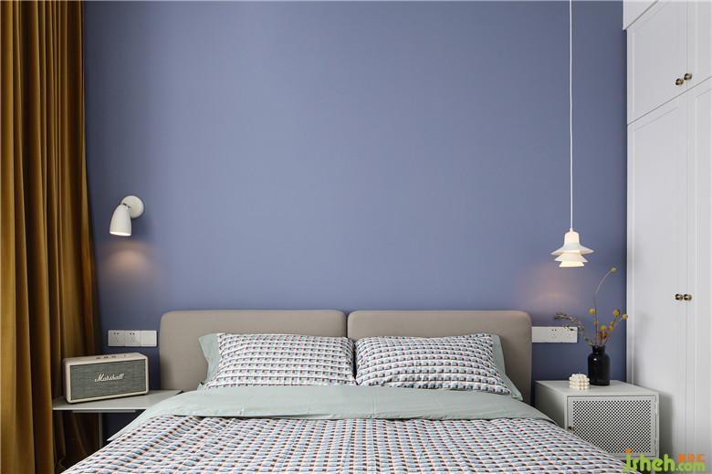 藍色的墻體揭開主臥的小北歐氣質,角落也不缺特別的細節(jié),床頭兩側的不對稱床頭柜和不對稱燈飾將趣味滲透進空間,姜黃色的絨面窗簾融化藍色冷感給主臥添上復古的韻腳。
