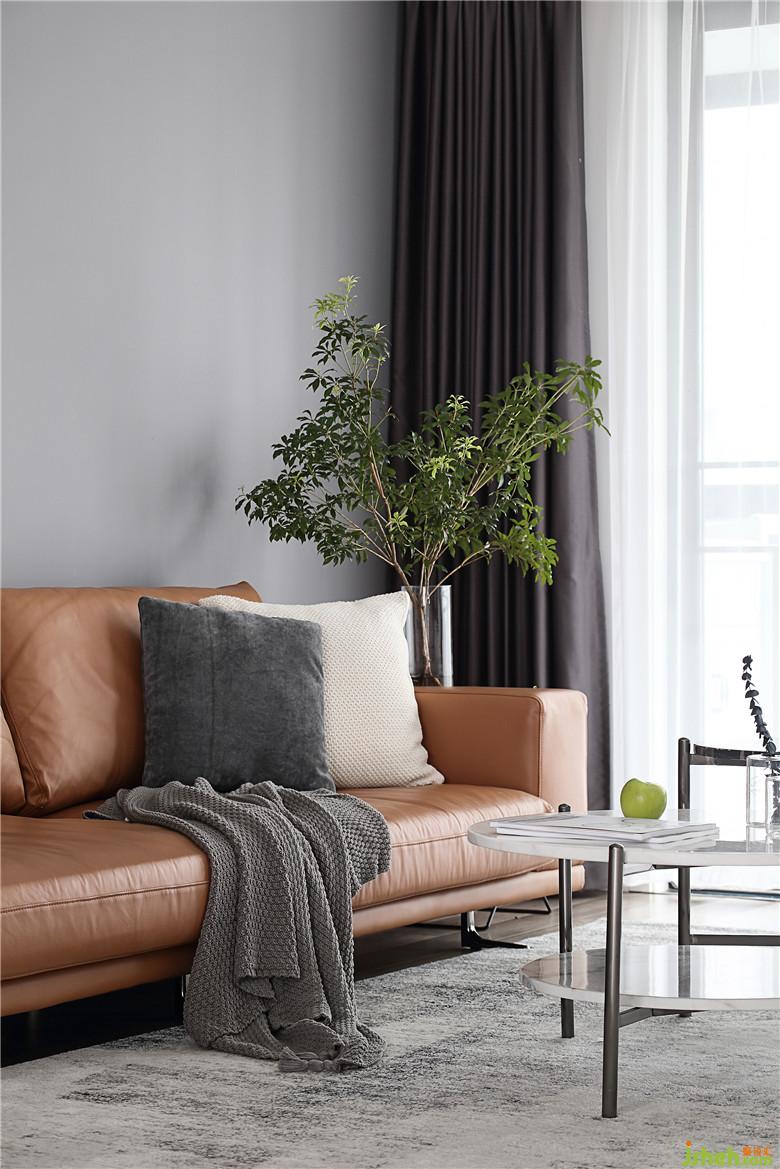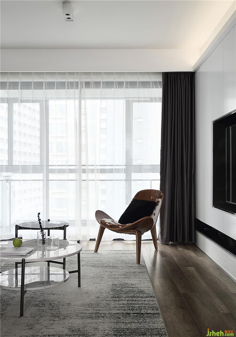 ▲沙發(fā)后的墻面是在黑白之間過渡開來的灰色,柔化了鮮明對比的銳利。臟橘色的沙發(fā),紫灰色的窗簾,灰色雜糅的地毯,在黑白大空間下流淌的各類灰色顯得分外和諧。茶幾的大理石與鐵架、黑與白,是質(zhì)感也是平衡,不同的角度呈現(xiàn)不同的觀感。