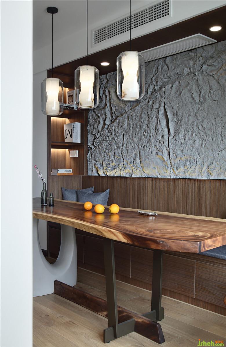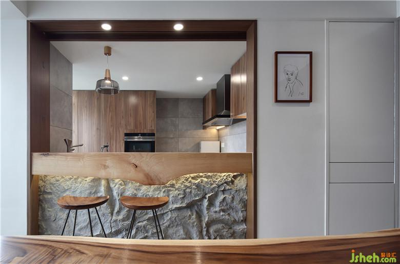 餐廳與廚房相鄰的一側做了半開放式與吧臺結合的設計,室內設計師用餐空間得到了提升也豐富了用餐形式。木質的吧臺臺面下緣并不平整,連接仿真石材的裝飾與卡座部分的墻面呼應。