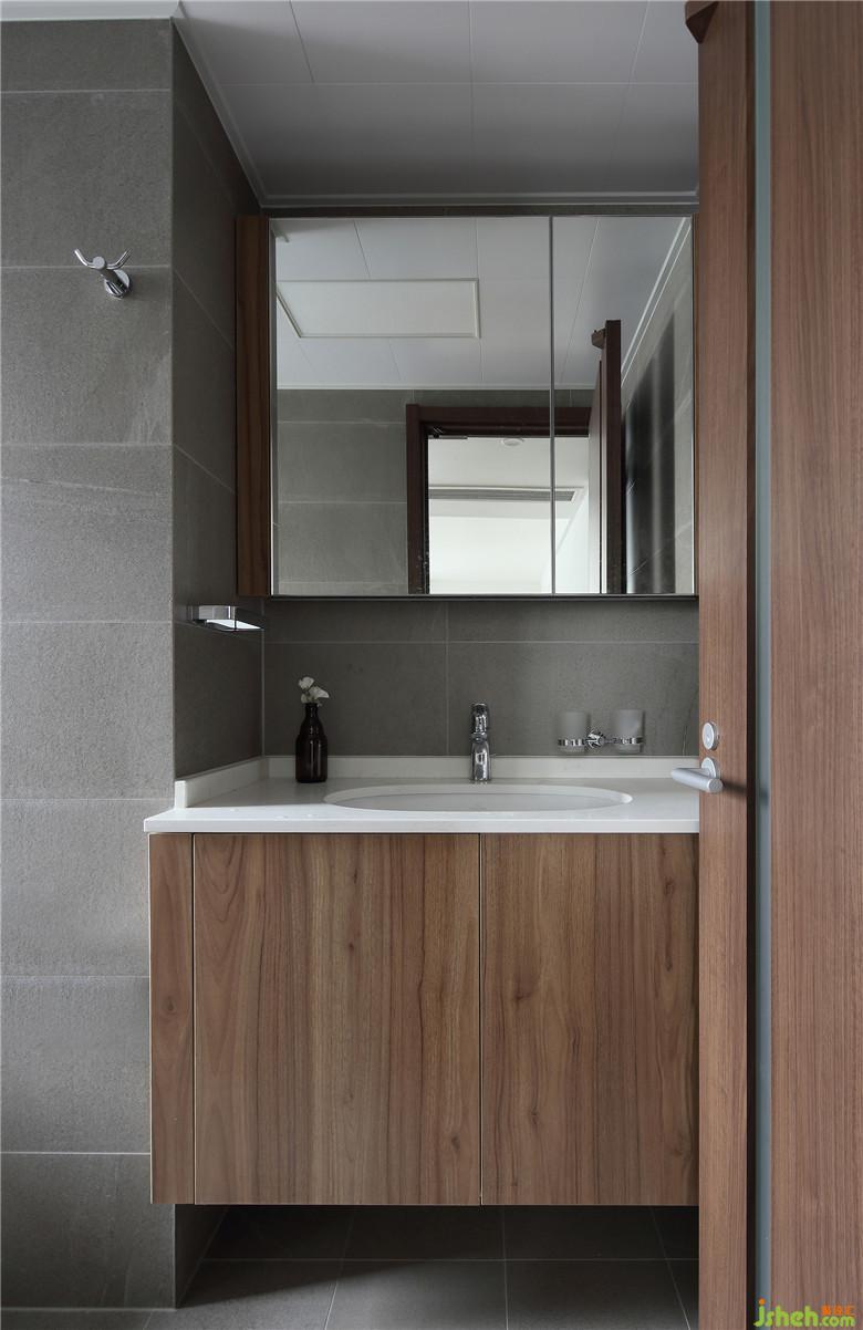 灰色的墻磚與臺盆柜的木色相映,衛(wèi)生間就應該是這樣潔凈、簡約。