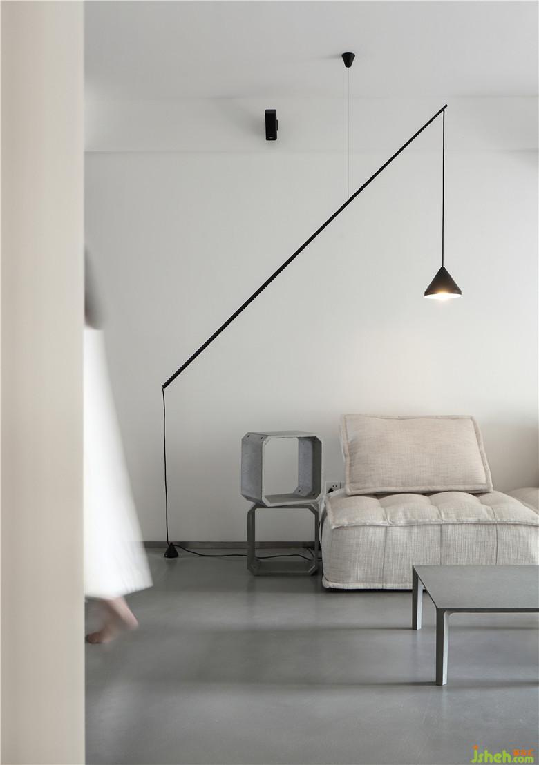 ▲設(shè)計感十足的線性吊燈,外表簡約個性。可以通過線控制角度,風(fēng)吹過搖動時有悠然的韻律。幾何形的邊幾也是水泥制的,可以自由組合,是內(nèi)斂又有趣味的小家具。