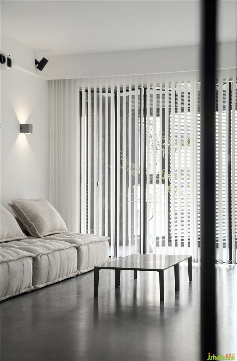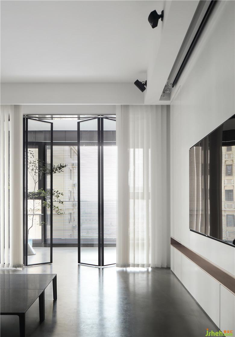 ▲客廳與陽臺直接,室內(nèi)設(shè)計師選用黑色鋁框玻璃折疊門隔斷,不會影響采光。窗簾是白色的豎百葉,無論打開還是合上都不會影響空間的通透感,還可以增添好看的光影。