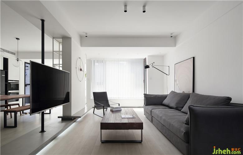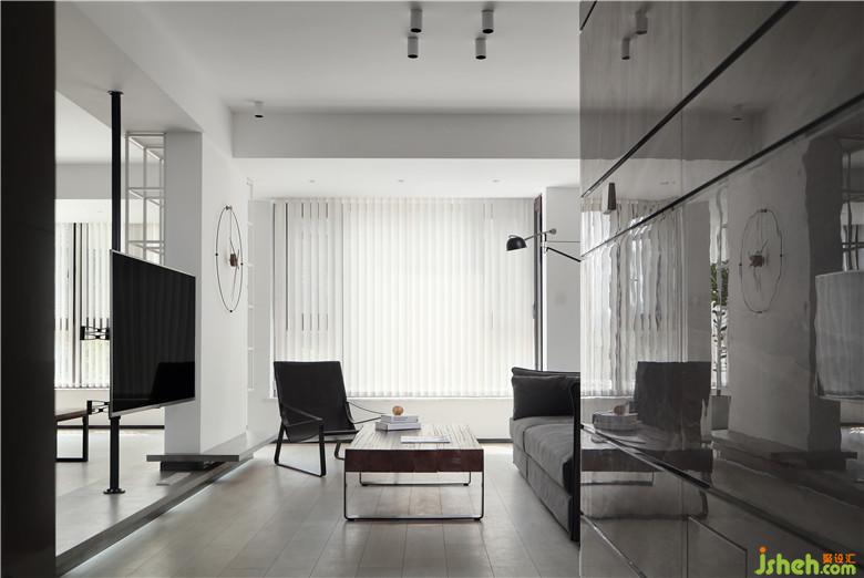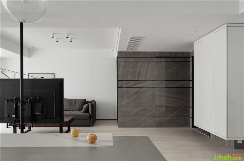 ▲入戶處的白色亮面烤漆柜體選擇了通頂不落地的形式,下方可以收納鞋物,方便進(jìn)出門。沙發(fā)一側(cè)沿凸出的墻體打一組開放式收納柜,啞光的黑色,讓視覺效果更豐富,也補(bǔ)充了收納功能。